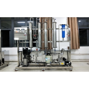 裝置整體尺寸1800*700*2200mm,工藝路線為高濃度的受污染水源,經(jīng)砂濾罐、炭濾罐、保安過濾器、超濾膜組件后,進(jìn)入凈水池,再經(jīng)納濾或者反滲透膜組件,進(jìn)入純水箱,出水電導(dǎo)率儀可達(dá)5μΩ/cm
