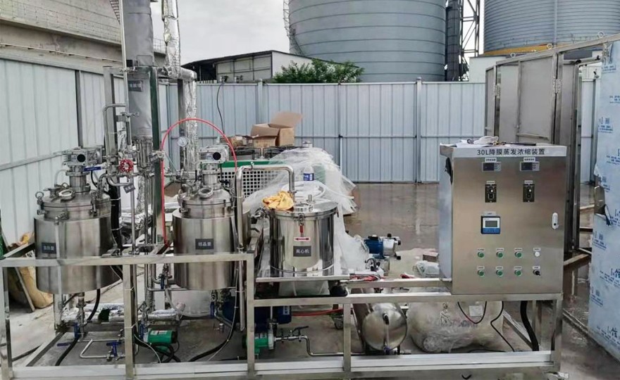 裝置尺寸為3000*800*2200mm,工藝路線為從前一工段來(lái)的經(jīng)濃縮和除雜后的濃海水,在加熱釜進(jìn)行pH調(diào)節(jié)并預(yù)熱后,打入降膜塔頂端,海水在自上而下流動(dòng)的過程中,被加熱蒸發(fā),并在降膜塔底部氣液分離后,氣相被水環(huán)真空機(jī)組帶出系統(tǒng)外,液相進(jìn)入結(jié)晶釜,降溫后析出鹽分,用壓縮空氣壓入離心機(jī)后實(shí)現(xiàn)固液分離。