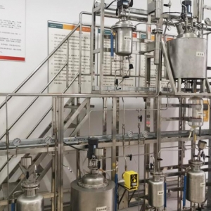 裝置整體尺寸4500*1200*3200mm,反應(yīng)工藝采用KOH作為催化劑,在一定溫度下,泔水油中的甘油三酯與甲醇發(fā)生酯交換反應(yīng),生產(chǎn)脂肪酸甲酯。再通過精餾方式提取中間產(chǎn)物,即得到生物柴油。